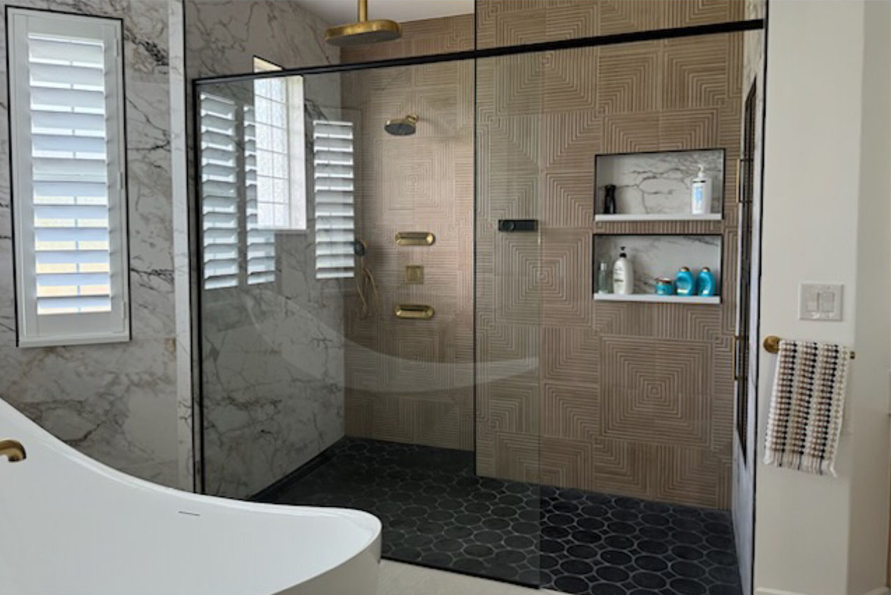 This project was all about bathing in luxury. We started by demolishing the space consuming tub surround and walled off shower in favor of a vessel bathtub and a shower three times the size. Utilizing three different contrasting tiles for the side walls, accent wall, and floor makes the black and gold fixtures pop.