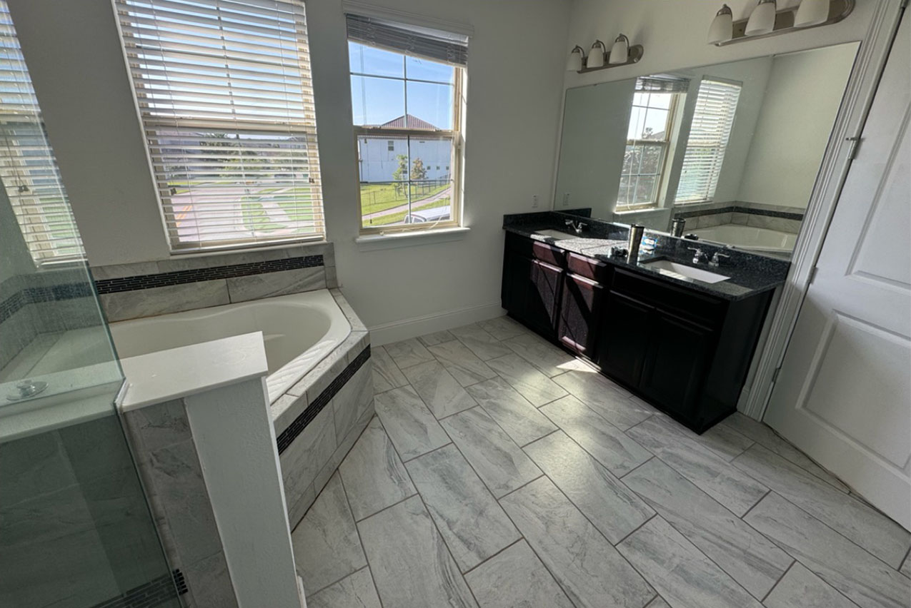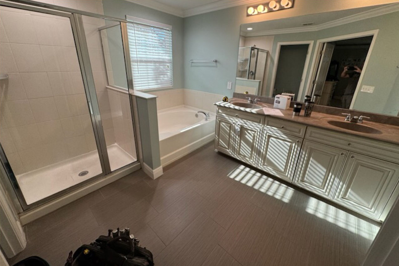 For this project, the client wanted to create color cohesion between all elements of the bathroom, while updating the space with more storage in the vanity. To achieve this, we separated the shower and tub, installing a free standing tub and frameless glass shower doors. We also fit a vanity to occupy the corner of both walls to almost double their storage space, with a center stack on top.